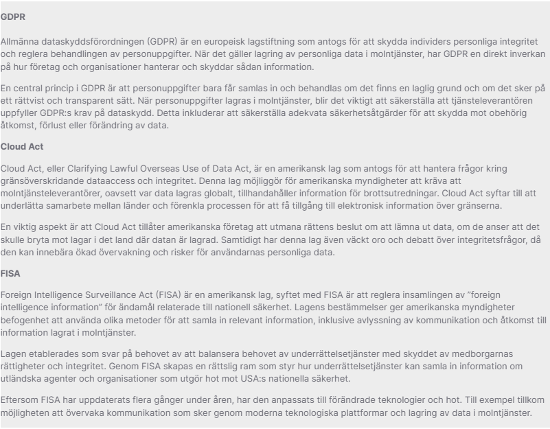 En annan kritisk aspekt är riskmedvetenheten kring FISA (Foreign Intelligence Surveillance Act) och Cloud Act, lagar som kan ha implikationer för datalagring och -hantering i molntjänster som inte är geografiskt bundna till Sverige. Att ha en egen krypteringsnyckel blir därmed avgörande för att möta dessa risker och upprätthålla svensk suveränitet över data.